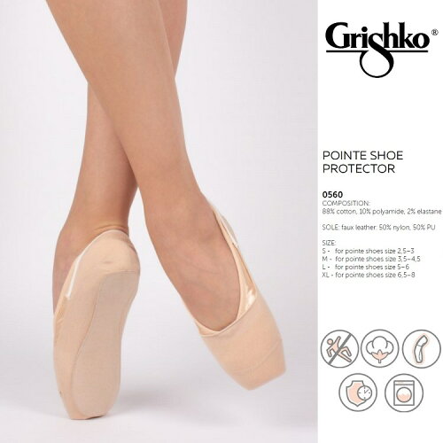 グリシコ ポワントシューズ プロテクター 0560 素材:綿88%・ナイロン(ポリアミド)10%・ポリウレタン(エラスタン)2% サイズ:S・M・L・XL カラー:ベージュ 【ポワントシューズ プロテクター 7つの特徴】 1. 大切なあなたのトゥシューズを長持ちさせます 2. 足裏に滑り止めが付いているので安心です 3. ご家庭の洗濯機で洗えます 4. 天然素材の綿を使用しているので通気性良好 5. 革新的な構造で伸縮性抜群 6. スキニーなベージュで足長見え効果 7. ゴム付きなのでトゥシューズをしっかり固定 サイズ表記 対応するトゥシューズサイズ S トゥシューズサイズ 2.5〜3.0 M トゥシューズサイズ 3.5〜4.5 L トゥシューズサイズ 5.0〜6.0 XL トゥシューズサイズ 6.5〜8.0 ※掲載商品はモニター環境等により実物とイメージが違う場合があります。