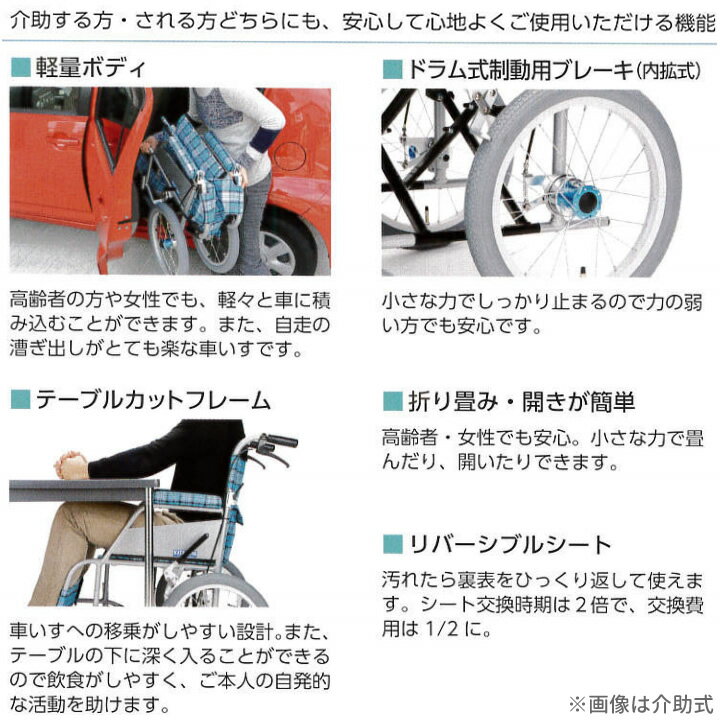 いつでもお買い得!!送料無料の車椅子クッションシートも付いて19,300円お尻も背中も痛くならない21,800円お尻も背中も痛くならない21,800円軽くて優しい 安全な乗り心地○ドラム式介助ブレーキ(標準装備)○肌触りが良く、耐光性の高いポリエステルシート○体重のかかるシートとフレームの接合部はソケット内臓でしっかりネジ止め○滑りにくいラジアルタイヤ○テーブルなどに深く入れる斜めカットの肘置きフレーム○シートとフレームの摩擦を防止する樹脂製部品○六角レンチひとつで簡単にできるステップ4段階調整 強度を要する箇所は二重フレームを採用○こんなところでラクラク!上り坂、車の積み降ろし、操作時の押し出し○安全・安心の高剛性フレーム仕様表詳細本体サイズ:高85×幅60.5×長94cm座面サイズ:幅40×奥40cm前座高:43cm後座高:40cm肘掛高:23cm背もたれ高:38cm折り畳みサイズ:高82×幅24×長65cm重量:9.0kg規格1台