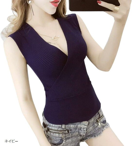 [FUPUTWO]ニットセーターレディースVネックトップス胸元セクシーノースリーブリブカシュクールカットソーストレッチニットが肌に心地よく、カシュクールデザインでさりげなくスタイルアップも叶うニット。