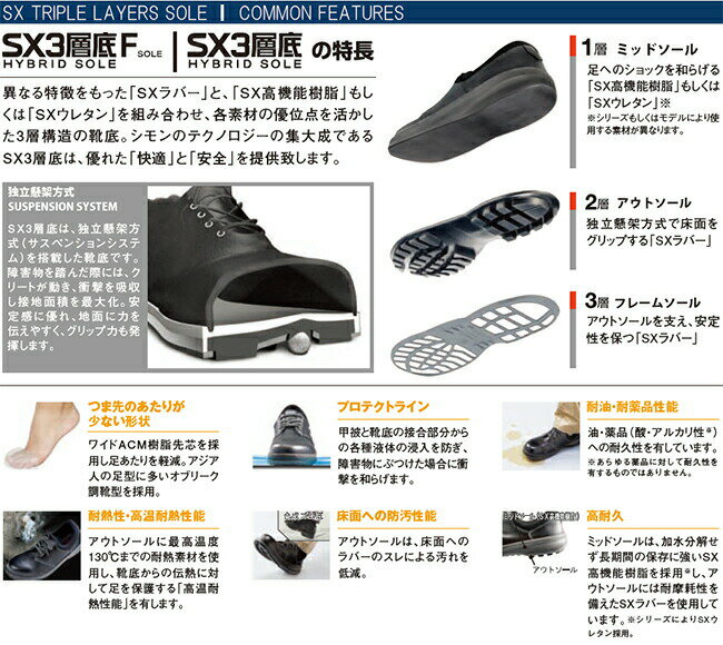 >> 23.5〜29.0cm(EEE)は コチラ >> 30.0cm(EEE)は コチラ 仕様 ・SX3層底(Hybrid Sole) ・ワイドACM樹脂先芯 ・帯電防止 ・外チャック付 機能 ・静電気帯電防止機能付 ↓↓シモン製品の選び方につきまして、詳しくは下記バナーをクリックしてください。